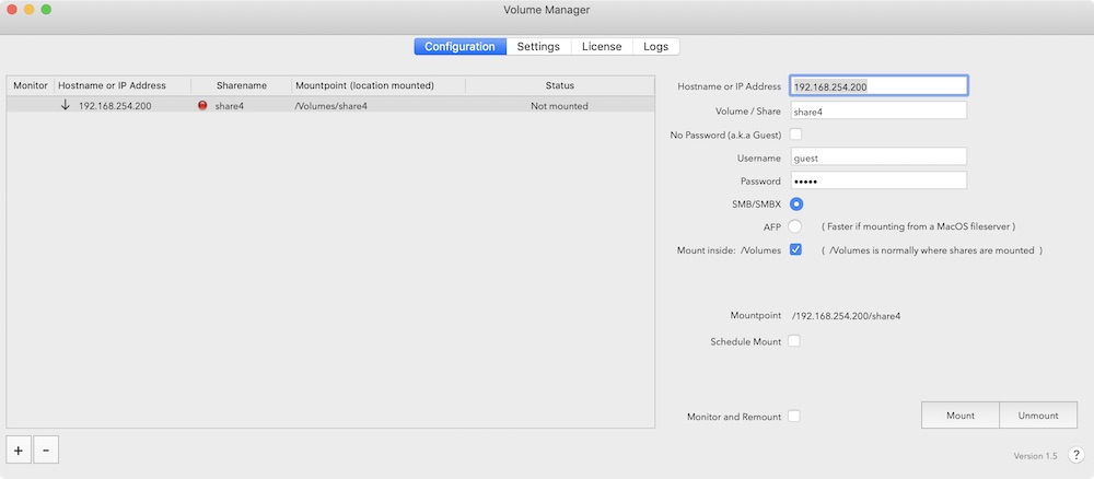 Tip: If you can manually connect in Finder (Command+K), you can automate the same connection in Volume Manager.